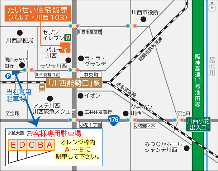 阪急宝塚線「川西能勢口」駅より北へ徒歩わずか1分。お気軽にお立ちより・ご来店ください。