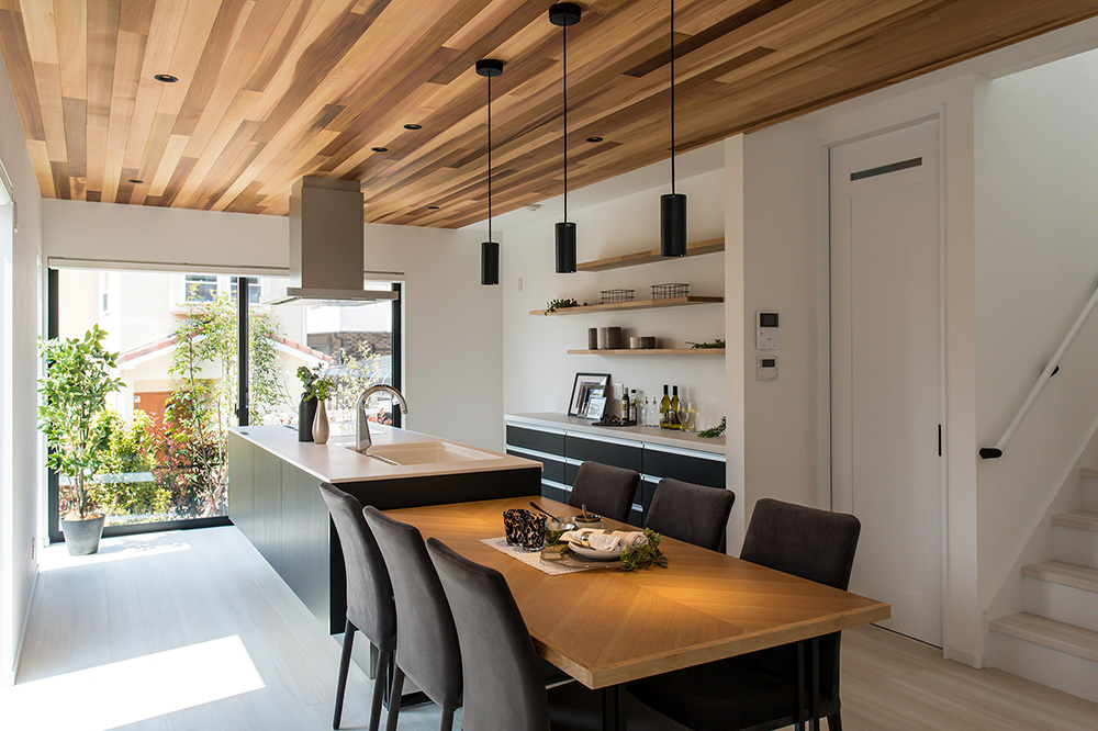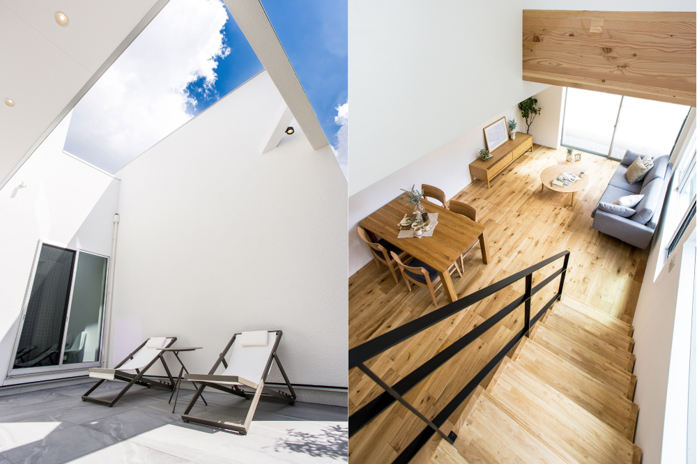 吹抜けや天窓、パティオなど、様々な要素で開放感を演出。